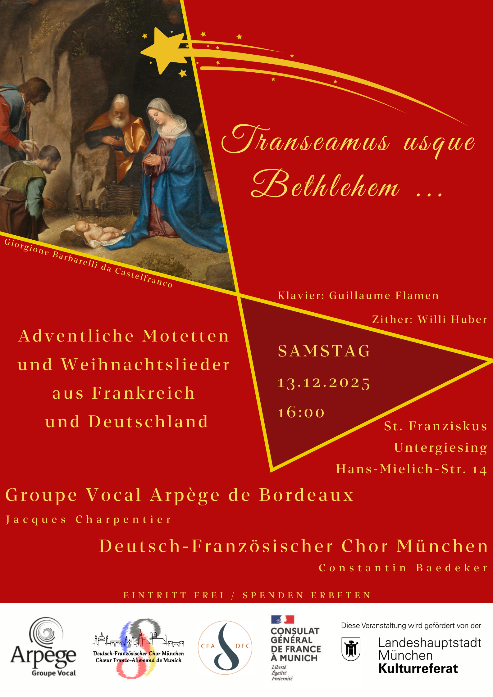Notre prochain concert: Le 13.12.205 16.00, le CFA de Munich et le groupe vocal Arpège Bordeaux chantent des motets de l’Avent et des Noëls dans l’église St Franziskus.