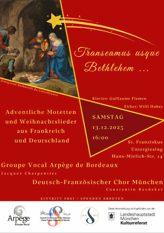 Unser nächster Auftritt: Am 13.12.2025, um 16.00 singen in St. Franziskus, der Deutsch-Französiche Chor München und « le Groupe vocal Arpège Bordeaux » adventliche Motetten und Weihnachtslieder.